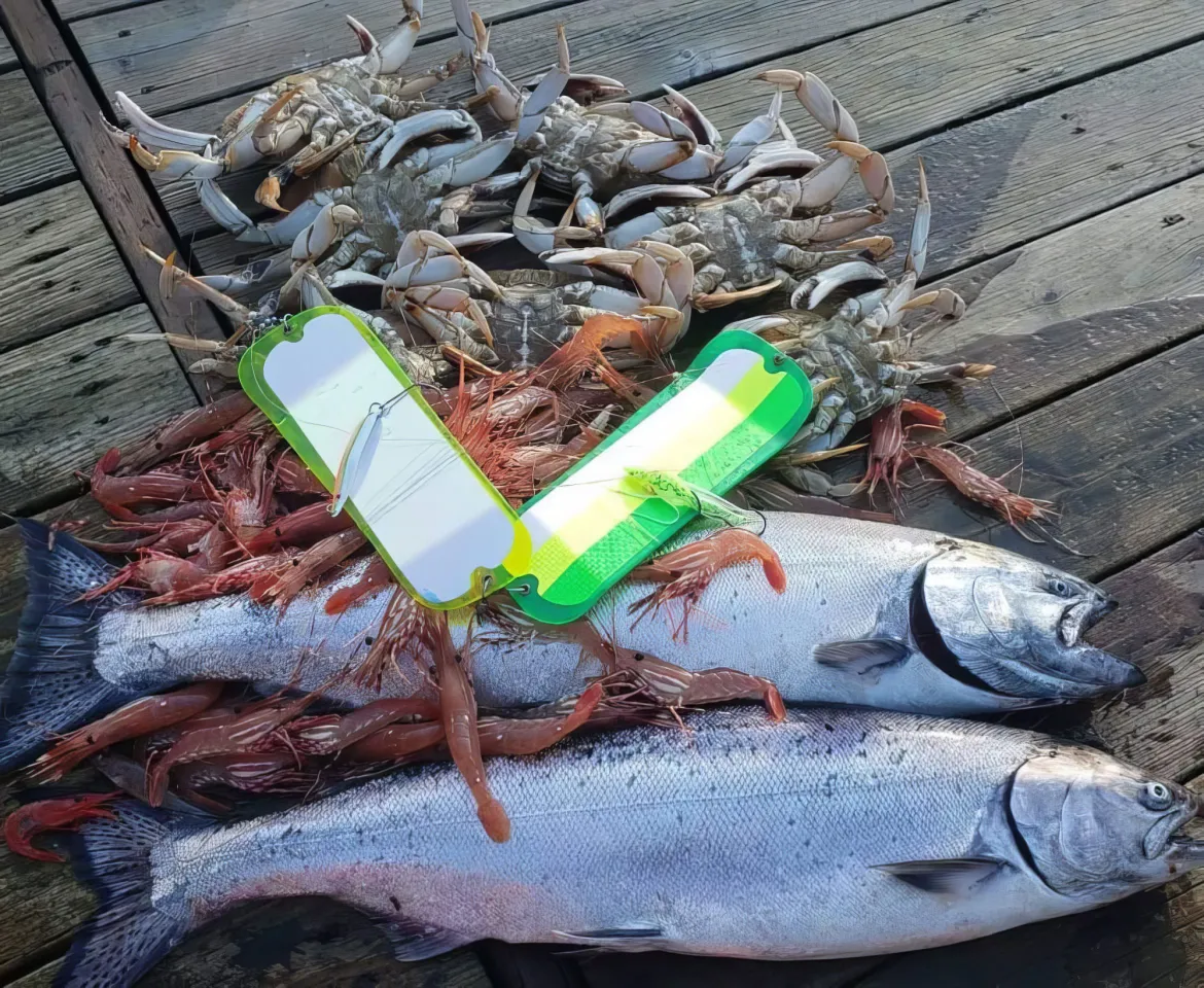 As usual we have been running our favourite winter chinook spoons and hootchies. We haven’t bothered running bait all winter as it is not necessary in the winter. Our winter spoon staples in the Vancouver area are Skinny G and G Force Spoons. We find the best patterns to be the Outfitter, Trailhead, Bon Chovy, No Bananas, Herring Aide and Irish Cream. We also run hootchies quite a bit this time of year with Yamashita green or chartreuse spacklebacks being our top producers. We pair up these lures with Gibbs Delta Guide Series Flashers and keep it pretty simple. The Bon Chovy, STS, Madi, and Lemon Lime patterns work for for us all winter long. When we were are fishing the Sidney and Southern Gulf Island’s we tend to run smaller presentations in the winter as the bait is a bit smaller. We have a lot of success on Coho Killers and Wee Gees!